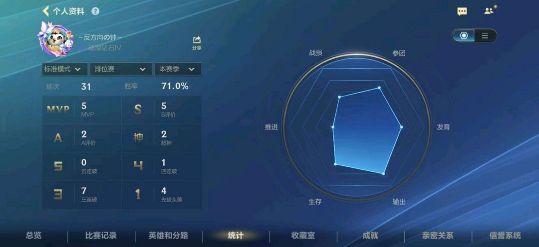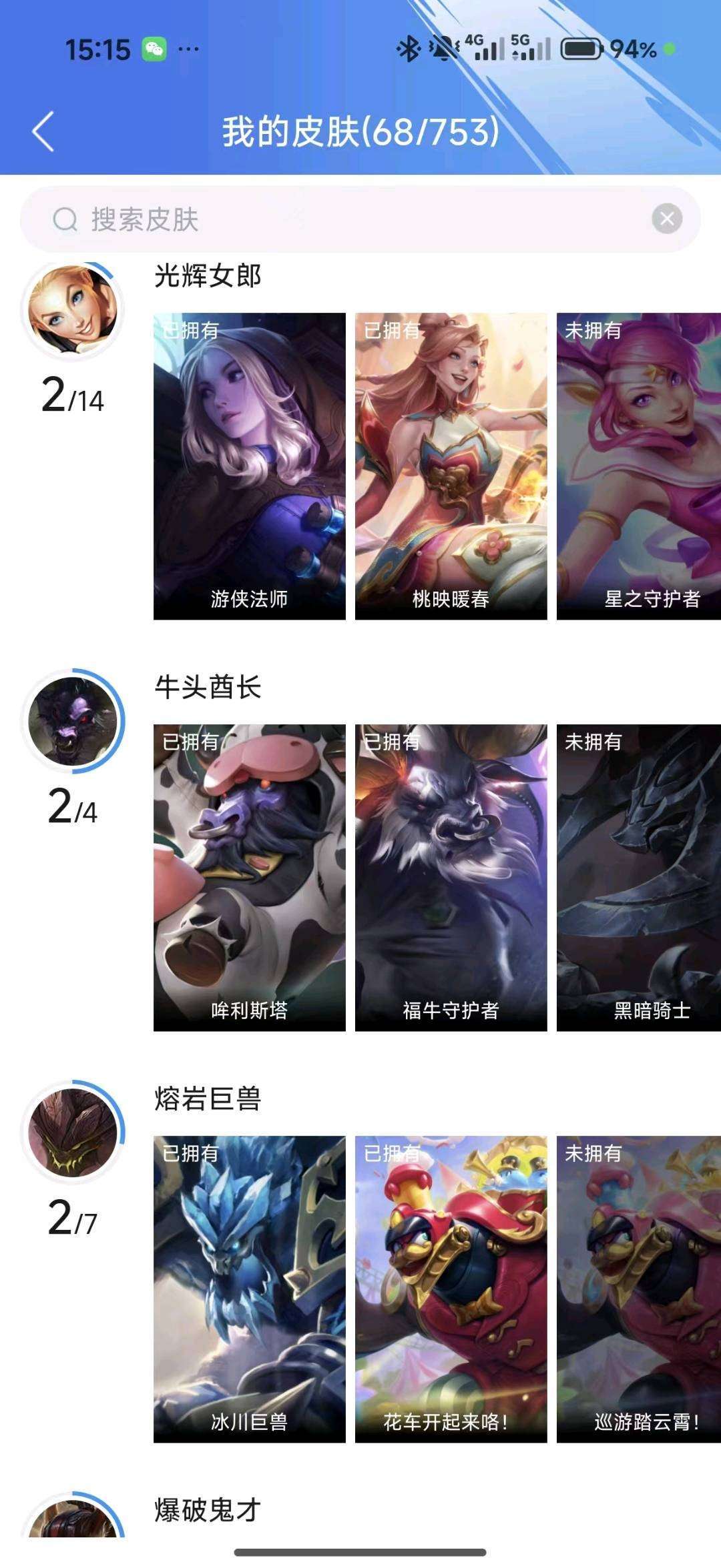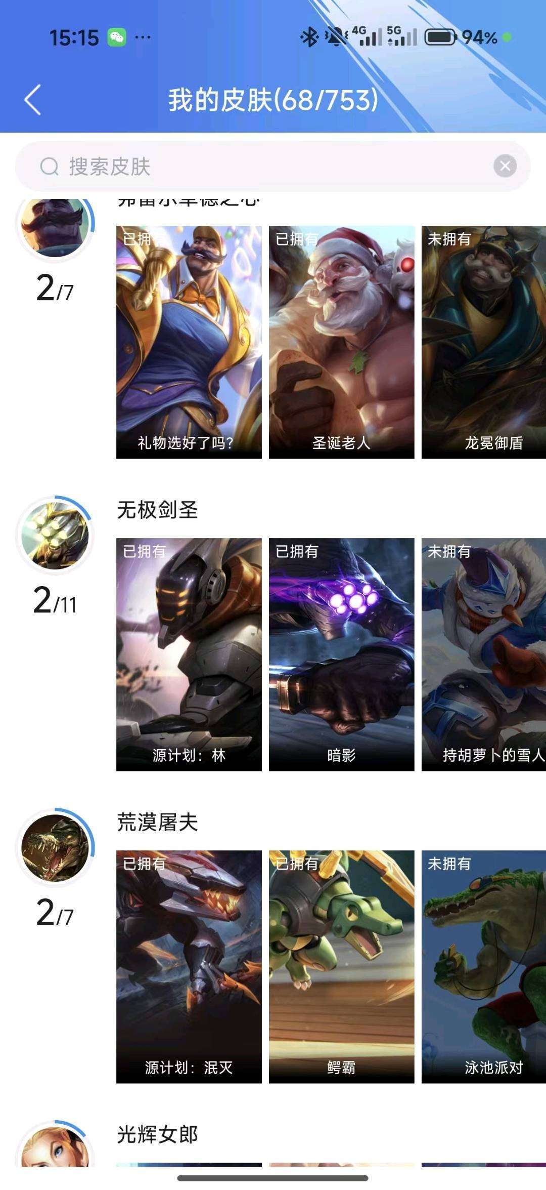 装备描述:璀璨钻石IV,本赛季排位31场、胜率71.0%,含5次MVP、5次S评价,对局表现稳定。 源计划系列:源计划·林(剑圣)、源计划·泯灭(鳄鱼)、源计划·裁决(蔚)、源计划·火(金克丝)福牛守护者(安妮、金克丝、牛头)、双城之战(蔚)、冰雪烈焰(安妮)、小红帽(安妮) 霸(鳄鱼)、冠翎御风使(迦娜)、星之守护者(光辉)等,覆盖多英