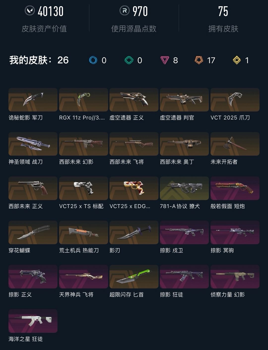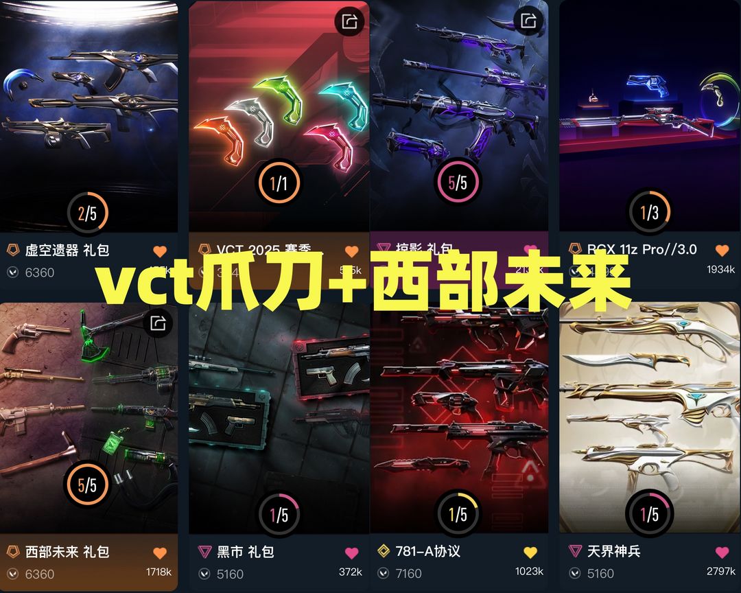 可排✨西部未来套装✨vct爪刀显卡爪刀穿花蝴蝶✨掠夺鱼缸✨781獠犬✨侦查力量幻影✨虚无虚空遗器