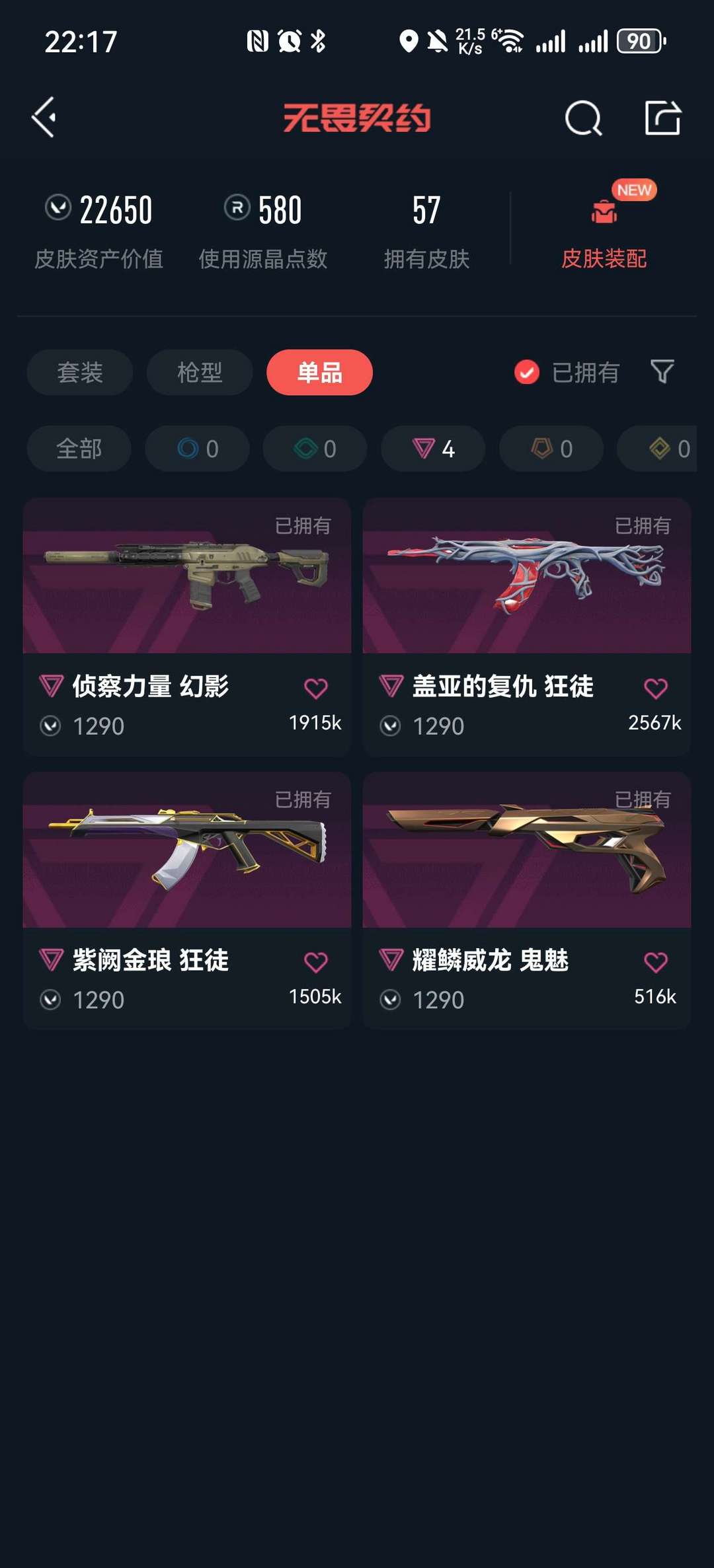 装备描述:5狂徒(混沌紫金流脓盖亚溯水)2幻影(源能娱乐侦查)苍龙冥狙,奇点蝴蝶剥皮刀,24EDG标配,威龙鬼魅,西部正义,huang金段位,请勿开挂,开挂会有平台介入索取赔偿,不要骂人QAQ,骂人禁言会影响与朋友开黑