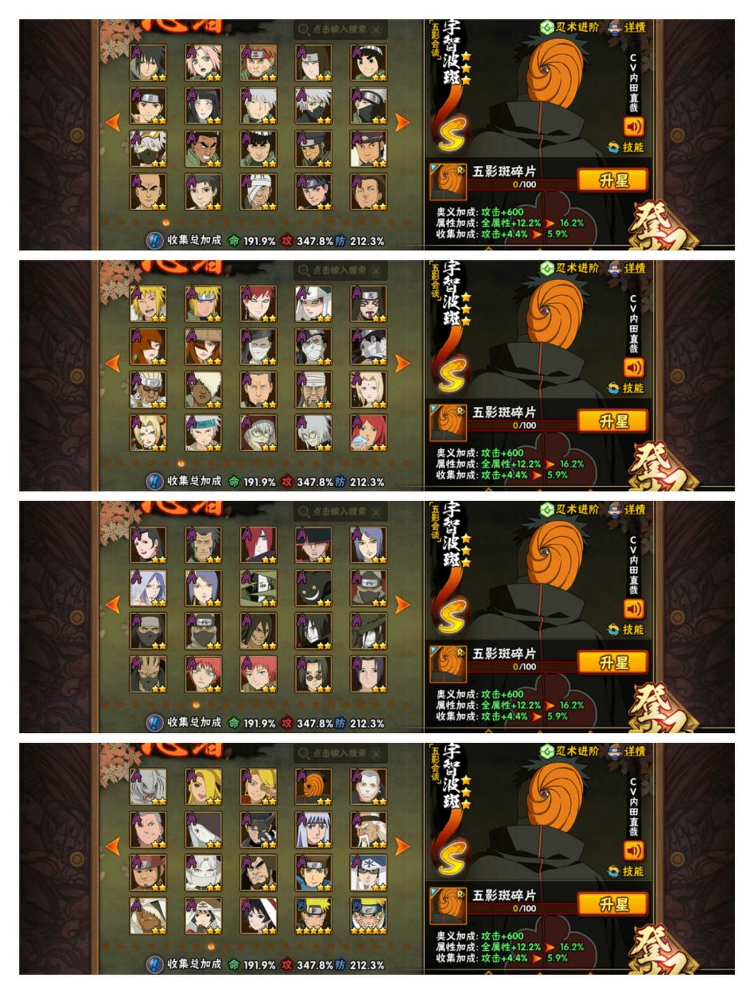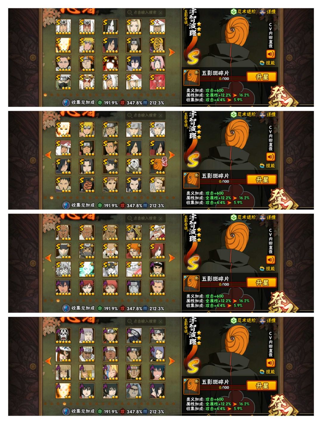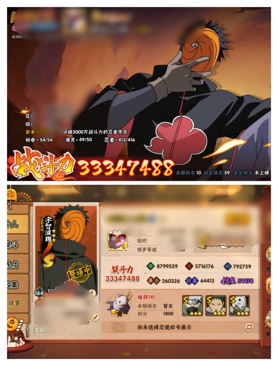 415全忍者☀五影会谈斑☀3340万73级魅力☀54S106A☀九喇嘛水门☀六尾鸣人☀V15全通灵