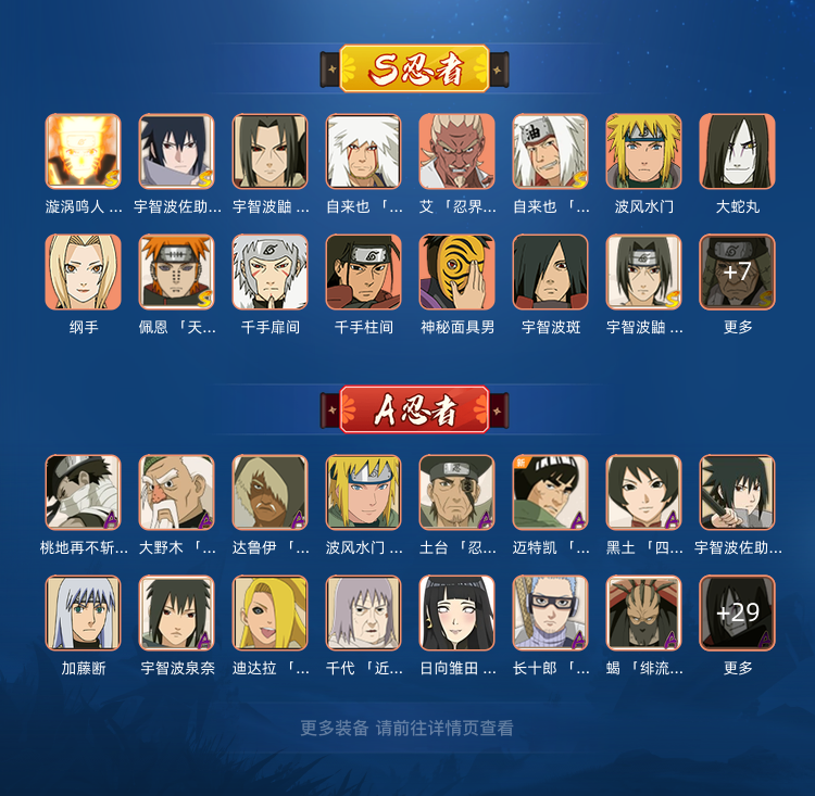 装备描述:须佐卡卡西★19S★1200w★百战水门★永恒佐助★秽土三代★九喇嘛鸣人★秽土鼬★死门凯★秽土三代
