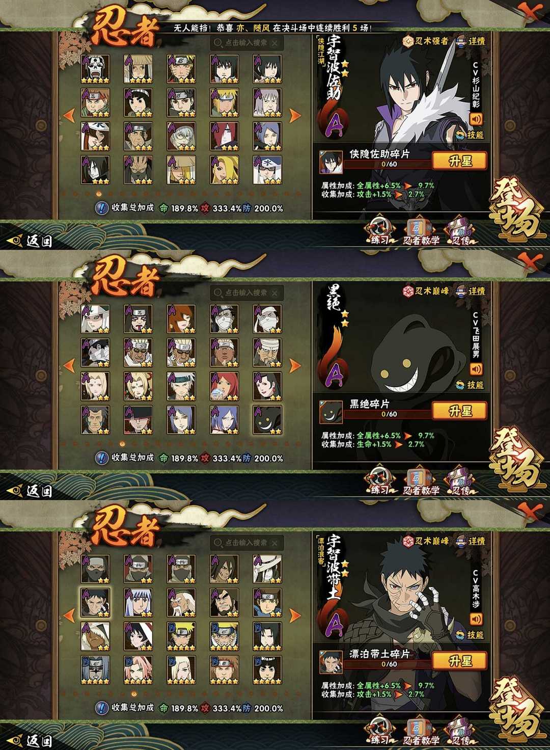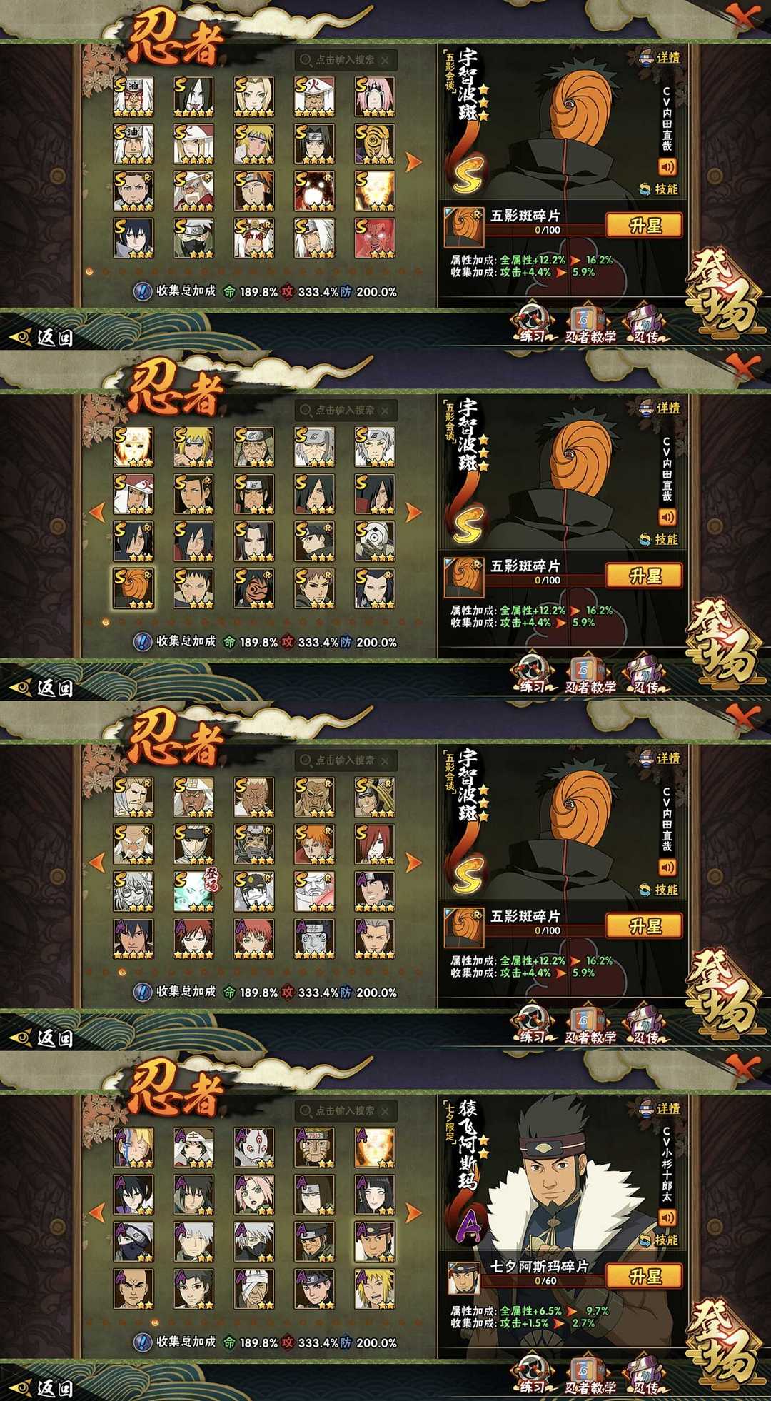 侠隐佐助✨黑绝漂泊带土✨3300w388全忍者✨54S+77A✨五影会谈斑✨妖怪纲手✨天道超卡卡西