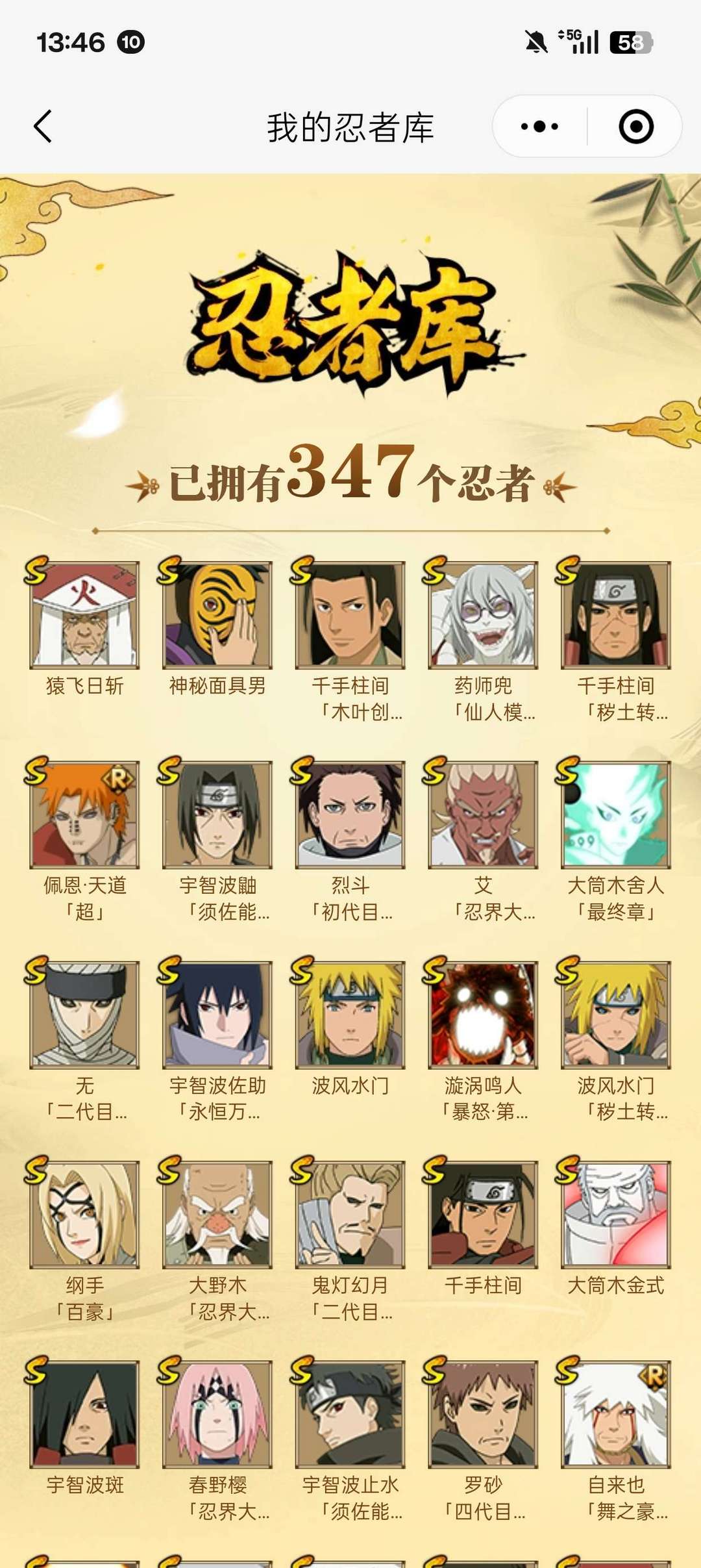 2650万战力347忍者49s,65a青春哥熊猫漂泊带土漂泊二代小南,热门忍者,值得体验欢迎大家