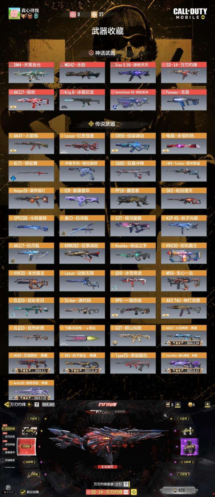 满级万刃灼锋♥雪林动能蛇刃末世霸主黑伊利精品战神号♥满级天策永别源核瞬影冰龙无畏巨擎粒子街机命运
