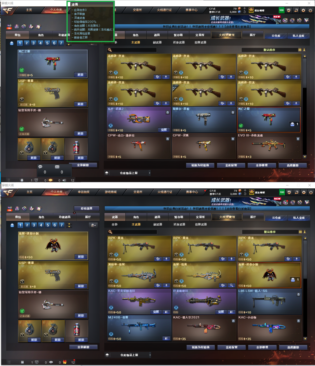 装备描述:排位:可以、、、、、、、生化全装(生化背包更换、可以看僵尸血量):无需换弹、6烈龙、3盘龙、2炼狱、炼狱小刚、死亡之眼、MAC-涂鸦、手斧镜、生化雷、超级对讲机、全部弹匣、、、、、、、、、爆破四防:幻神音效(冠军之幻)、2个USP雷暴、COP雷霆、COP堕天神、2个COP雷霆王者、冠军之特、星神、传说暗裔、白虎、蔷薇、王者蔷薇、、、幻神音效、星神音效、蔷薇音效、雷神音效、白虎音效、毁灭音效、屠龙音效、烈火音效、火麒麟音效、、、7套雷暴、7套雷霆、6套堕天神、7套夜魔、2套幻兽、1套雷霆王者、、、爆破四防(王者春、王者貂蝉、王者魅影、王者炽天使、王者小乔、王者炫)