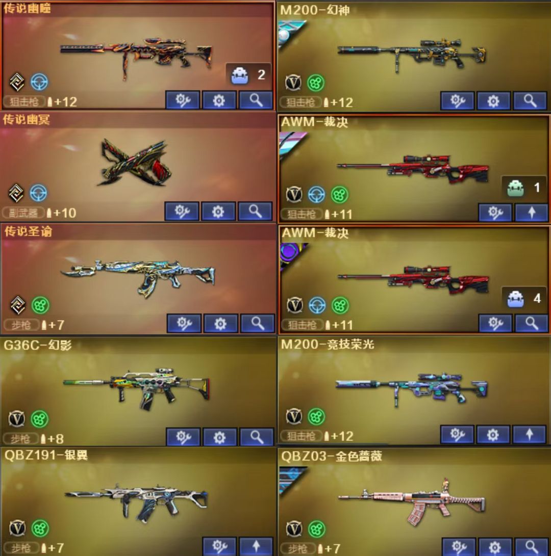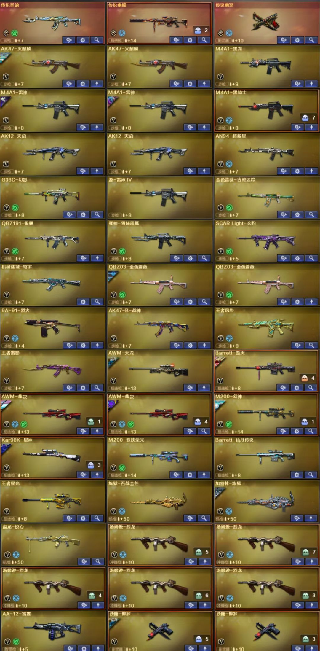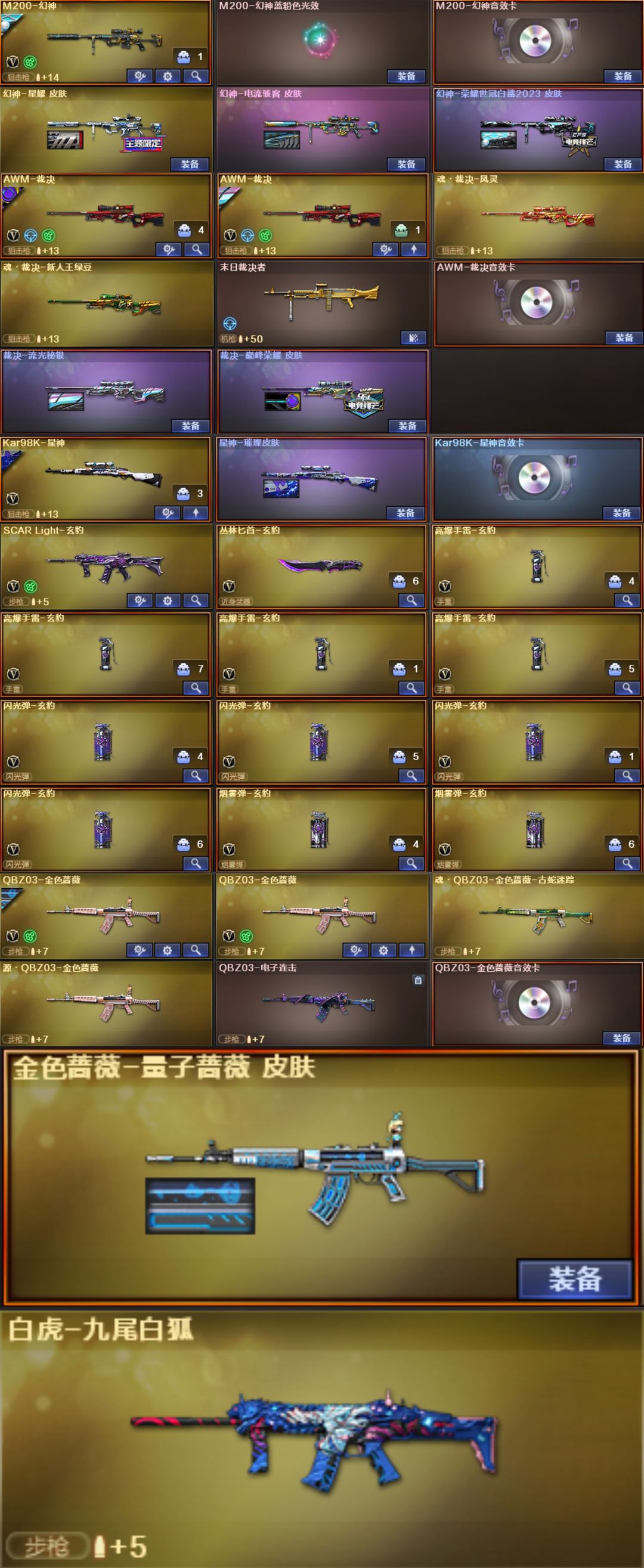装备描述:王者武器:盘龙-悦心-觉醒版;烟雾弹-雷暴王者;王者雷影;王者星光;王者风势-觉醒版 英雄武器:AK47-火麒麟;Barrett-碧霄极光;Barrett-碧霄极光;沙鹰-修罗;烟雾弹-玄豹;SCAR Light-玄豹;高爆手雷-玄豹;闪光弹-玄豹;丛林匕首-玄豹;加特林-炼狱;USP-冥王;M4A1-黑骑士;传说圣谕;机械迷城-穹宇;M4A1-雷神;汤姆逊-烈龙;AWM-天龙;屠龙;AWM-裁决;擎天;龙啸-烈火龙威;柯尔特-荣耀世冠白鲨2023;AK47-B-战神;G36C-幻影;M200-幻神;Barrett-毁灭;AA-12-雷霆;AK12-天启;Kar98K-星神;AN94-超新星;9A91-烈火;传说幽冥;沙鹰-天神;传说幽瞳;QBZ03-金色蔷薇;Barrett-暗月传说;M4A1-黑龙;麒麟刺;闪光弹-竞技荣光;高爆手雷-竞技荣光;柯尔特-竞技荣光;烟雾弹-竞技荣光;擎天-竞技荣光;M200-竞技荣光;炽芒蝶刃 角色:电竞教官-云悠悠;关小雨;星际战将;研;猎狐者;刀锋;堕天使;活力灵狐;娜塔莎;影武者-X;救世主-X;剑齿虎-X;潘多拉-锋芒精英;毒蝎-X;狐妖儿;玄