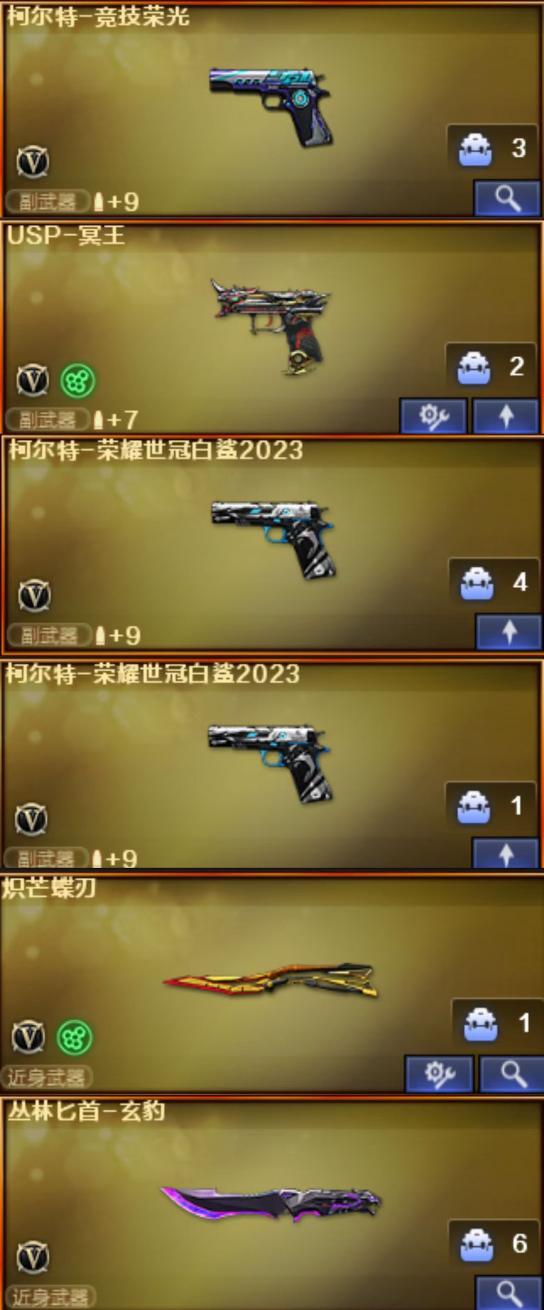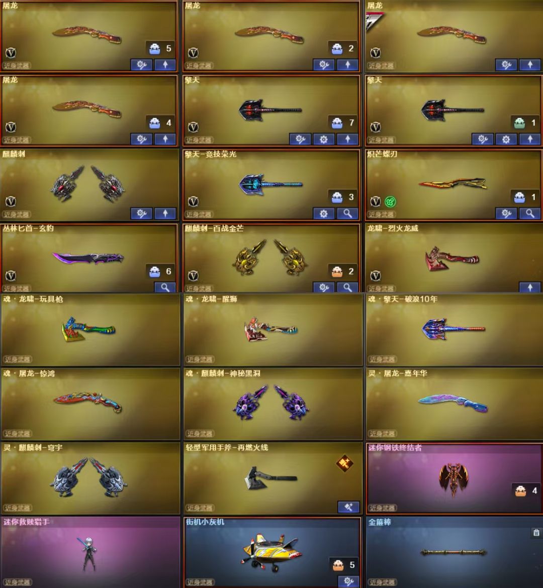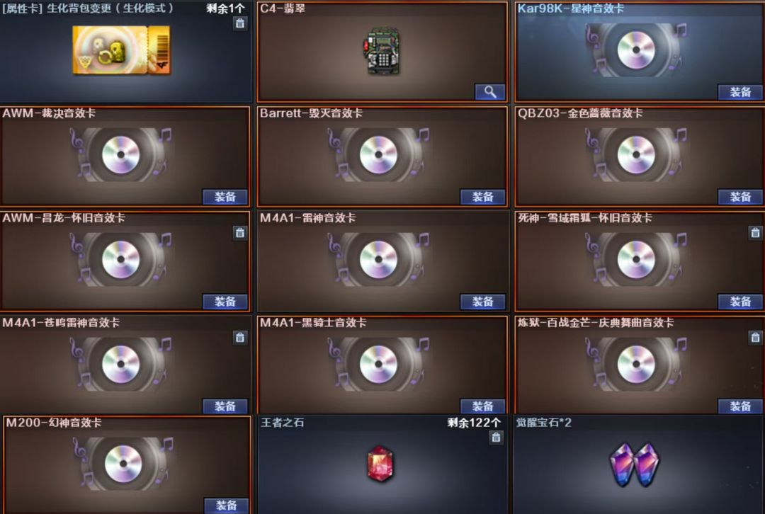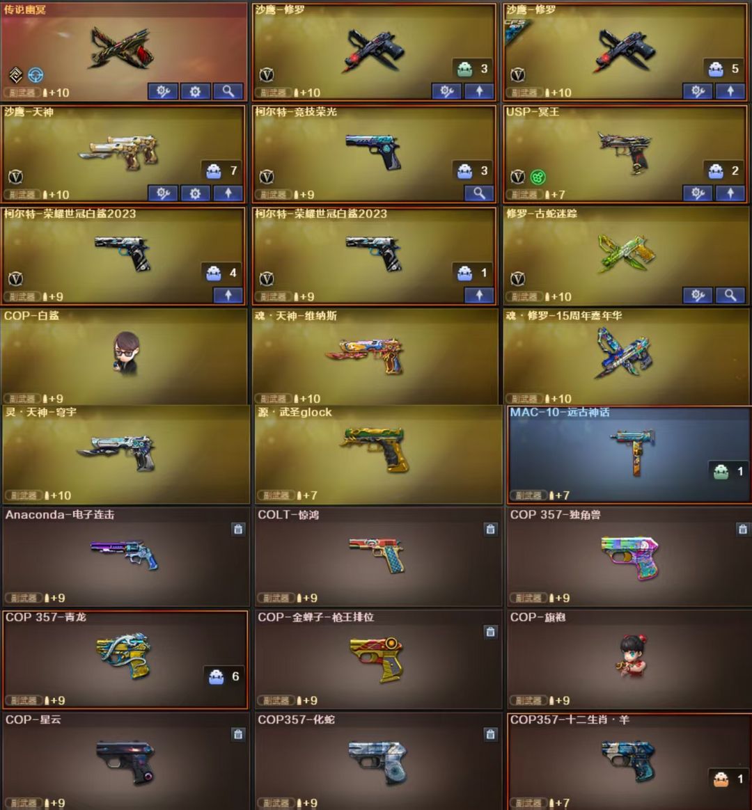装备描述:王者武器:盘龙-悦心-觉醒版;烟雾弹-雷暴王者;王者雷影;王者星光;王者风势-觉醒版 英雄武器:AK47-火麒麟;Barrett-碧霄极光;Barrett-碧霄极光;沙鹰-修罗;烟雾弹-玄豹;SCAR Light-玄豹;高爆手雷-玄豹;闪光弹-玄豹;丛林匕首-玄豹;加特林-炼狱;USP-冥王;M4A1-黑骑士;传说圣谕;机械迷城-穹宇;M4A1-雷神;汤姆逊-烈龙;AWM-天龙;屠龙;AWM-裁决;擎天;龙啸-烈火龙威;柯尔特-荣耀世冠白鲨2023;AK47-B-战神;G36C-幻影;M200-幻神;Barrett-毁灭;AA-12-雷霆;AK12-天启;Kar98K-星神;AN94-超新星;9A91-烈火;传说幽冥;沙鹰-天神;传说幽瞳;QBZ03-金色蔷薇;Barrett-暗月传说;M4A1-黑龙;麒麟刺;闪光弹-竞技荣光;高爆手雷-竞技荣光;柯尔特-竞技荣光;烟雾弹-竞技荣光;擎天-竞技荣光;M200-竞技荣光;炽芒蝶刃 角色:电竞教官-云悠悠;关小雨;星际战将;研;猎狐者;刀锋;堕天使;活力灵狐;娜塔莎;影武者-X;救世主-X;剑齿虎-X;潘多拉-锋芒精英;毒蝎-X;狐妖儿;玄