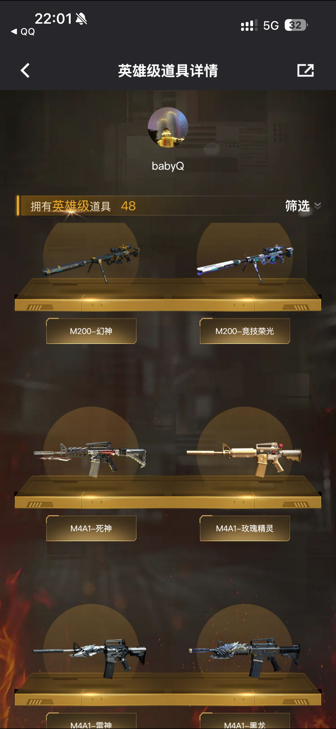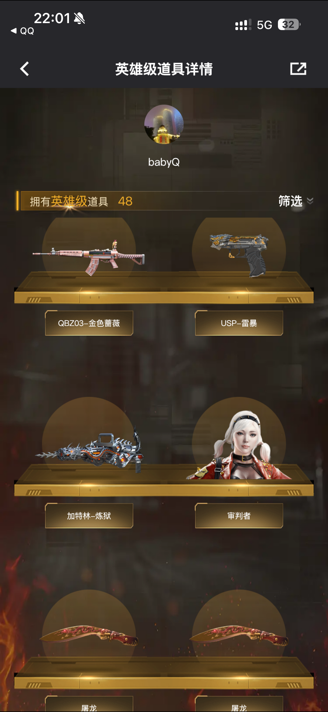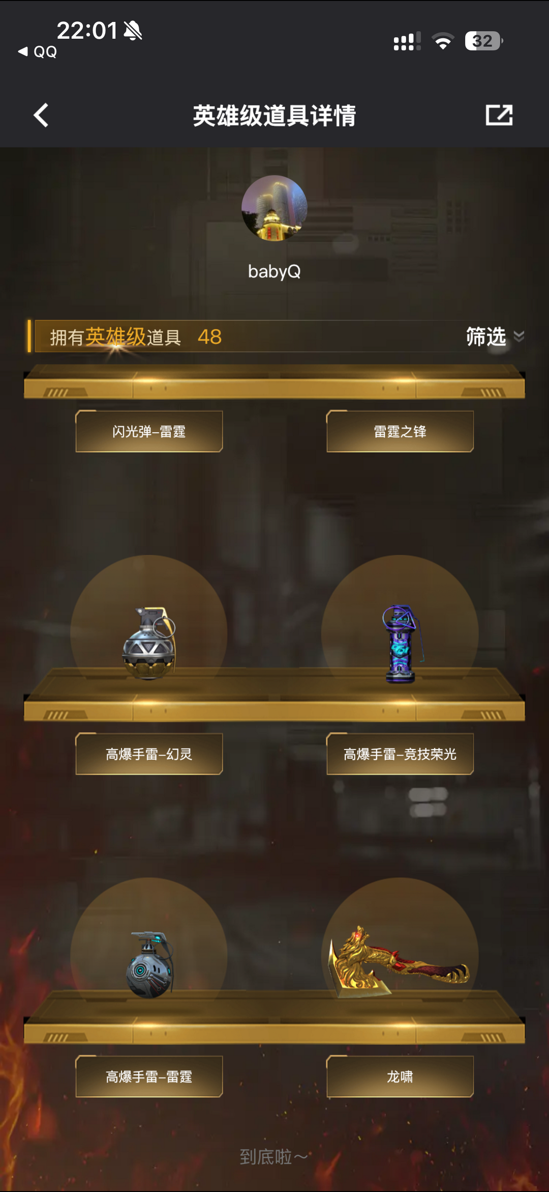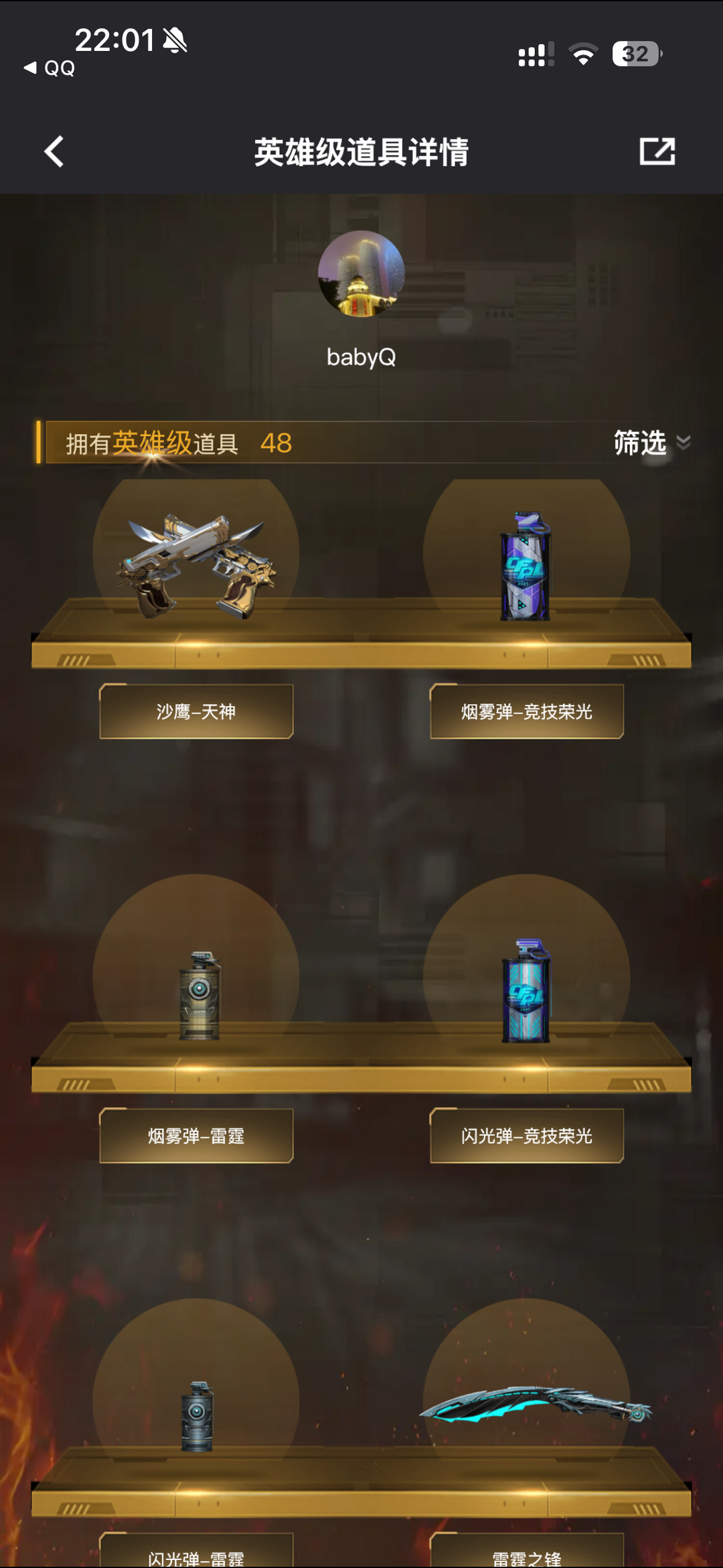 装备描述:王者之影-觉醒版;王者之锋-觉醒版;王者之啸-觉醒版;炫金雷神;烟雾弹-竞技荣光;闪光弹-竞技荣光;高爆手雷-竞技荣光;USP-雷暴;M200-竞技荣光;沙鹰-修罗;高爆手雷-幻灵;屠龙;M200-幻神;龙啸;HK417-朱雀;加特林-炼狱;AA-12-雷;M4A1-黑龙;雷霆之锋;高爆手雷-雷霆;烟雾弹-雷霆;闪光弹-雷霆;QBZ03-金色蔷薇;Barrett-毁灭;沙鹰-天神;Barrett-极光;M4A1-死神;擎天;M4A1-玫瑰精灵;AK47-火麒麟;汤姆逊-烈龙;M4A1-雷神 角色:审判者;王者-葵-貂蝉