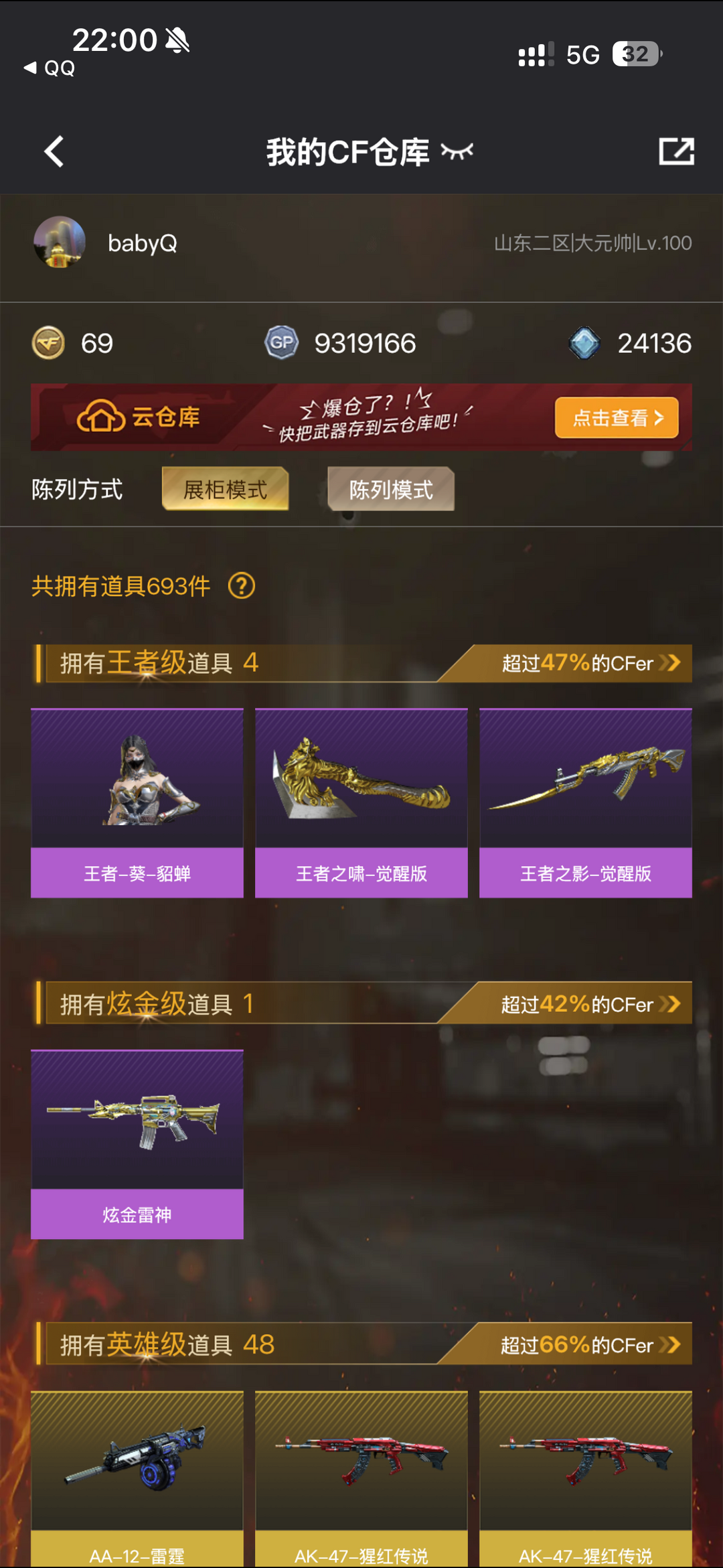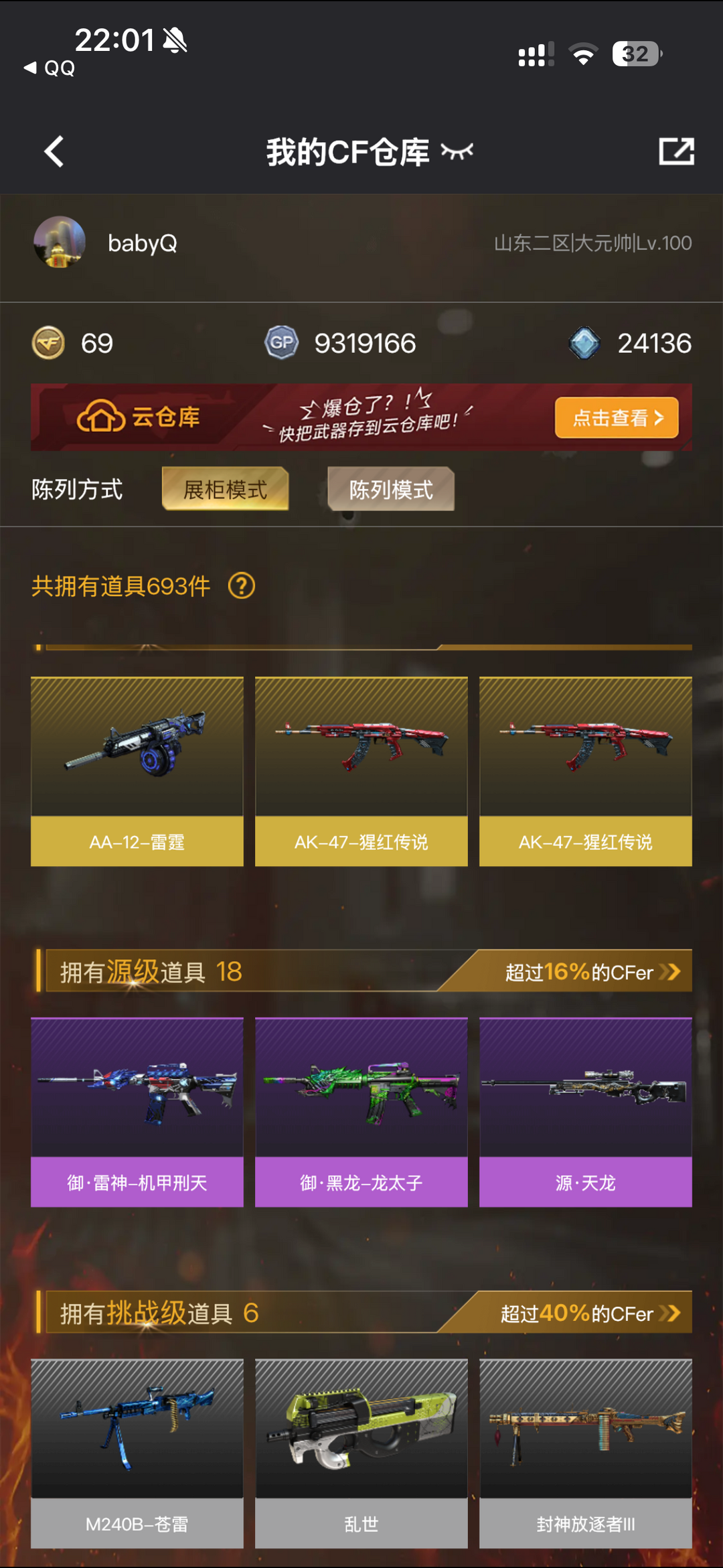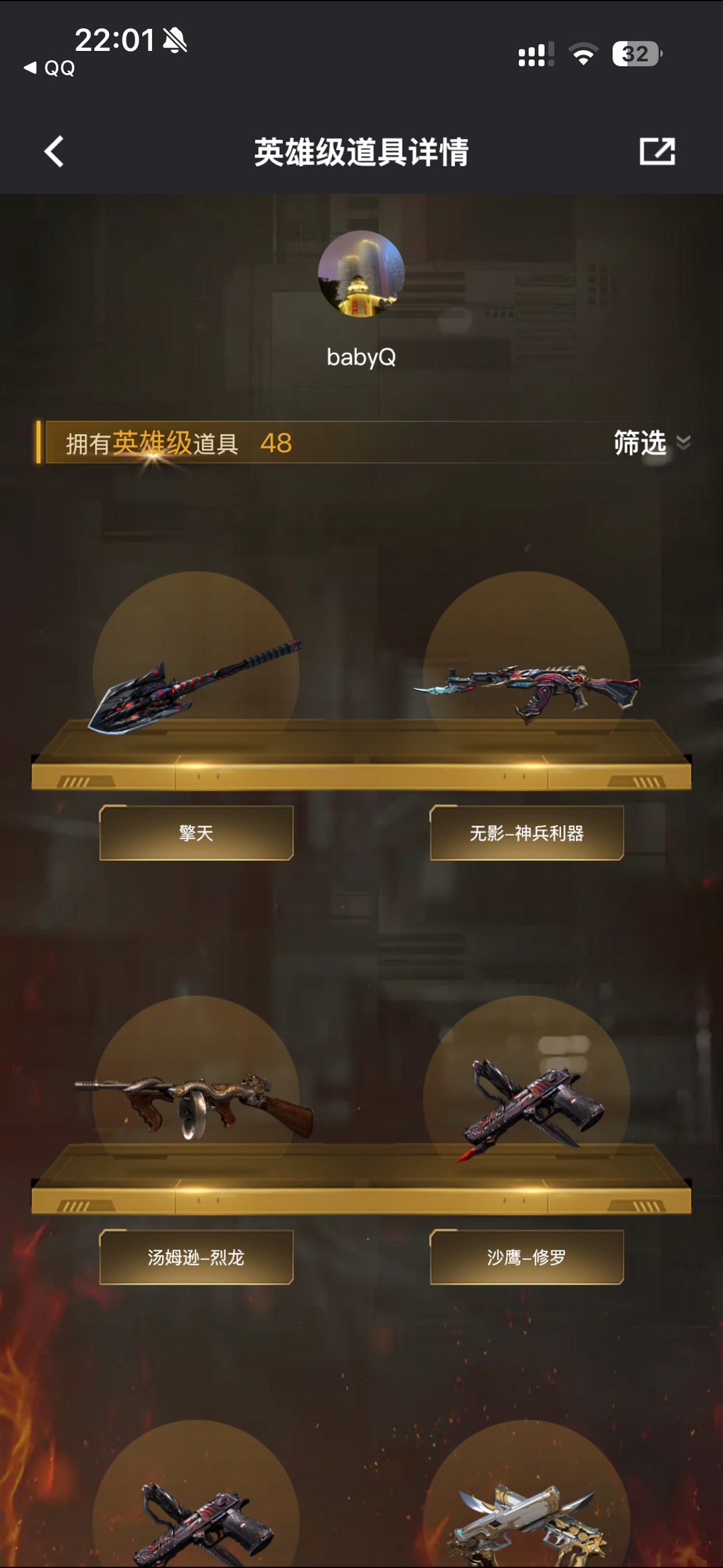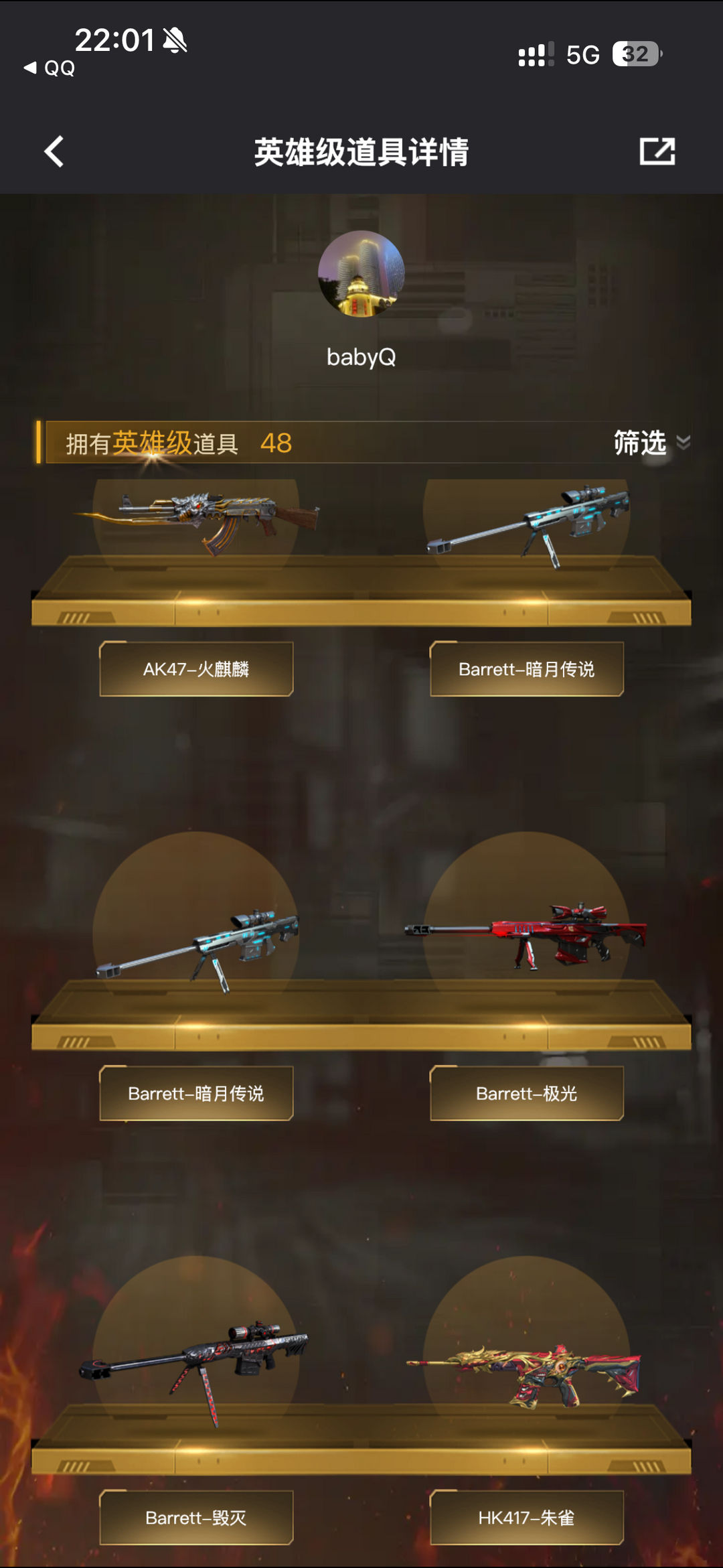 装备描述:王者之影-觉醒版;王者之锋-觉醒版;王者之啸-觉醒版;炫金雷神;烟雾弹-竞技荣光;闪光弹-竞技荣光;高爆手雷-竞技荣光;USP-雷暴;M200-竞技荣光;沙鹰-修罗;高爆手雷-幻灵;屠龙;M200-幻神;龙啸;HK417-朱雀;加特林-炼狱;AA-12-雷;M4A1-黑龙;雷霆之锋;高爆手雷-雷霆;烟雾弹-雷霆;闪光弹-雷霆;QBZ03-金色蔷薇;Barrett-毁灭;沙鹰-天神;Barrett-极光;M4A1-死神;擎天;M4A1-玫瑰精灵;AK47-火麒麟;汤姆逊-烈龙;M4A1-雷神 角色:审判者;王者-葵-貂蝉