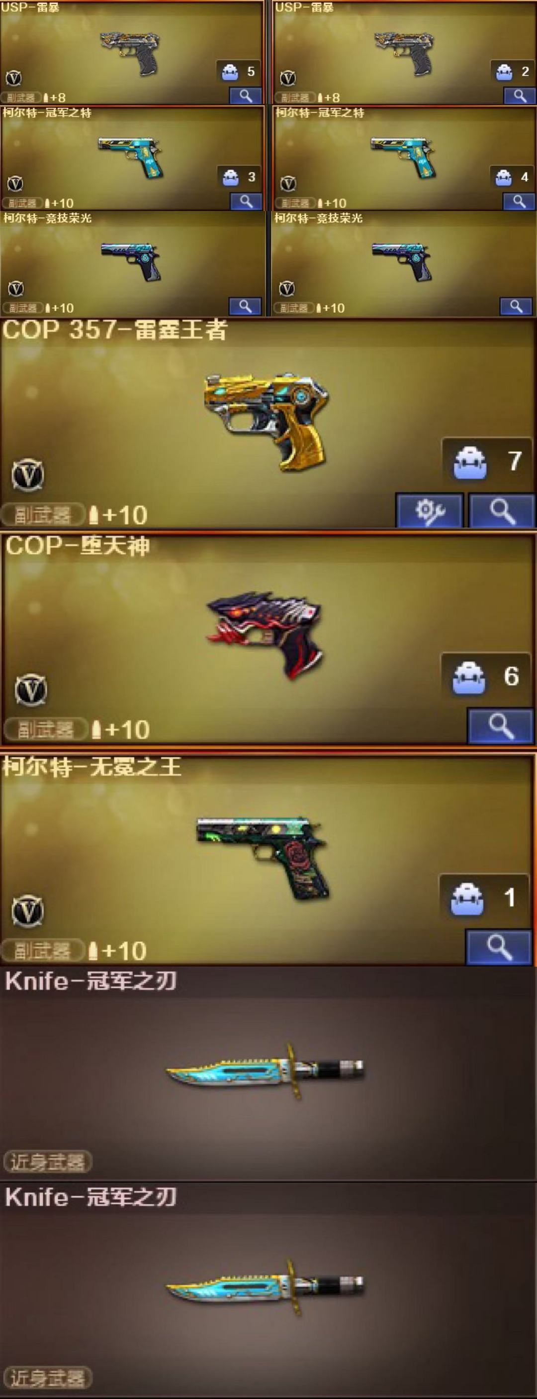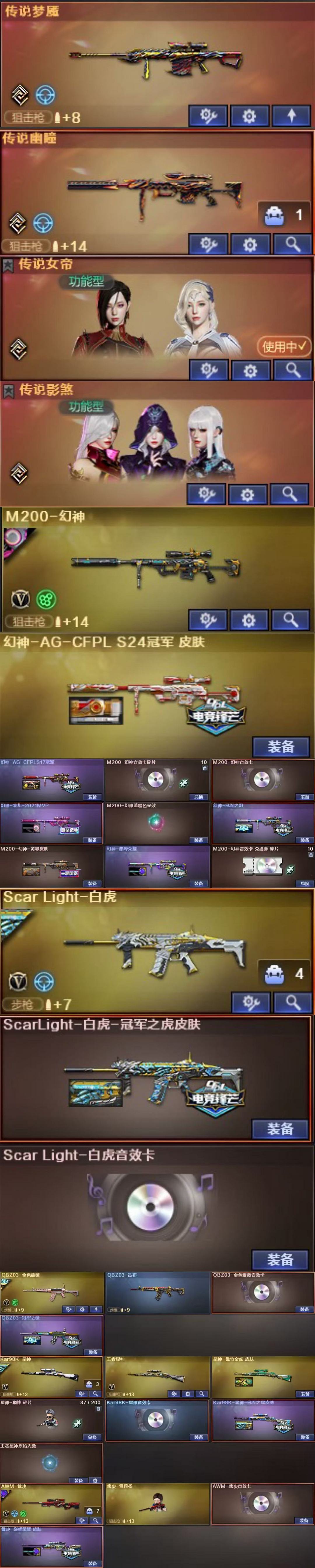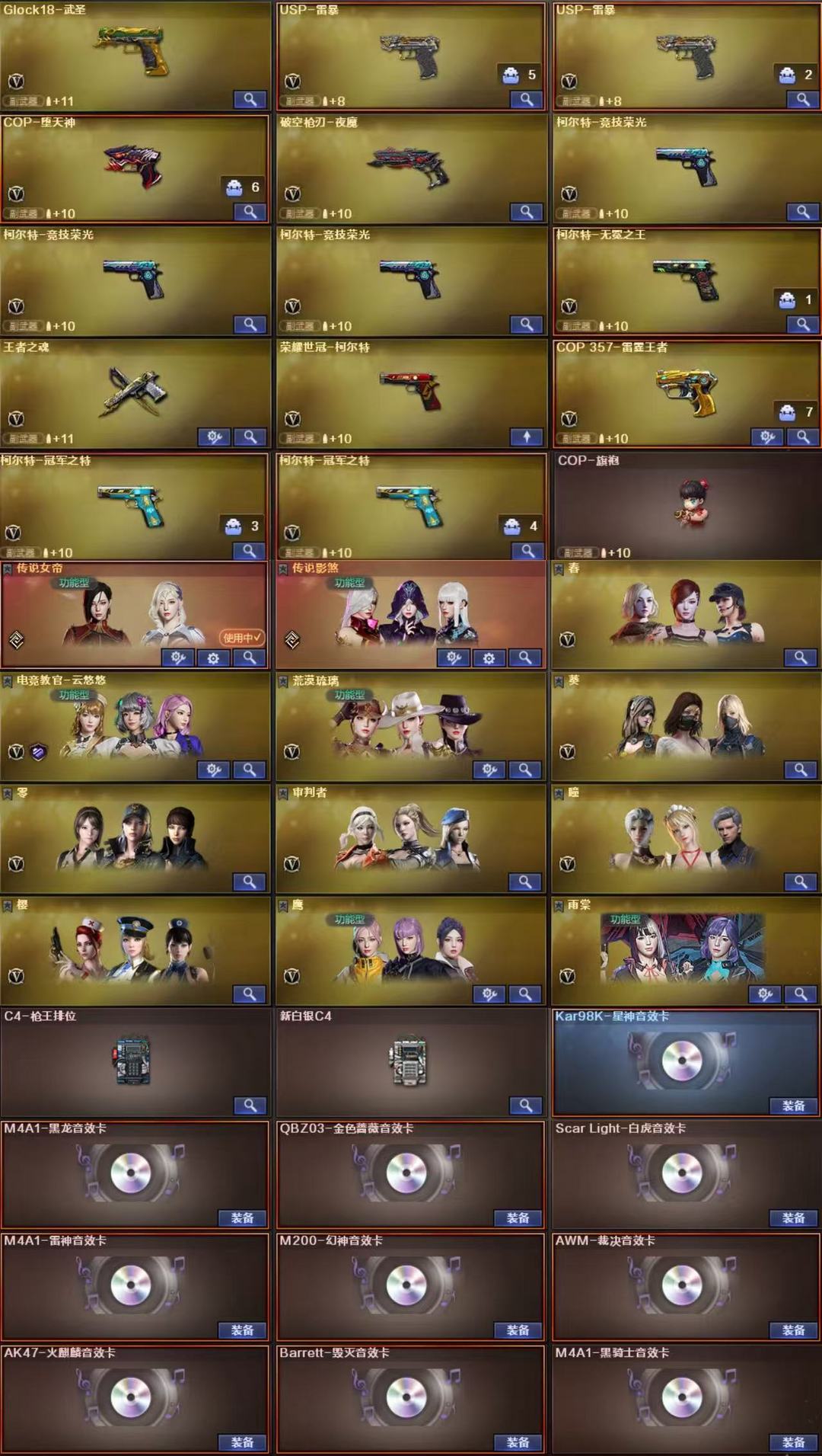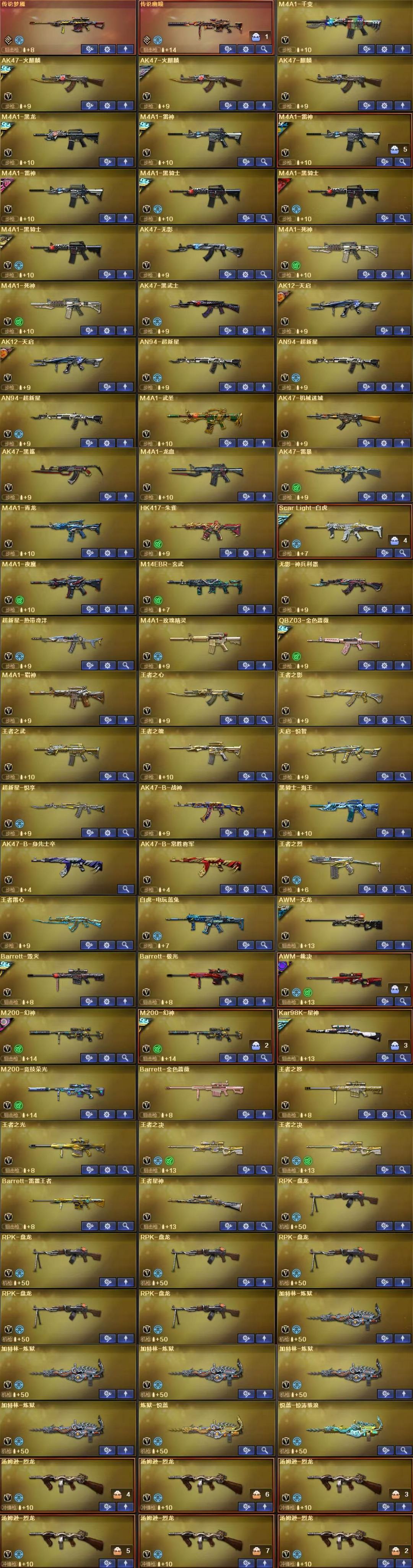 装备描述:王者武器:王者霜心;王者之决-觉醒版;炫金骑士;超新星-悦享-觉醒版;炫金火麒麟;王者星神-觉醒版;Barrett-雷霆王者-觉醒版;王者龙血;王者之魄-觉醒版;王者之光-觉醒版;王者之魂-觉醒版;王者之怒-觉醒版;天启-悦智-觉醒版;王者之武-觉醒版;王者之影-觉醒版;王者之烈-觉醒版;炼狱-悦蓝-觉醒版;COP 357-雷霆王者-觉醒版;王者之锋-觉醒版;高爆手雷-雷霆王者;闪光弹-雷霆王者-觉醒版;王者之心-觉醒版;王者之击-觉醒版;王者之啸-觉醒版;王者之啸;烈龙-悦心;王者之怒;炫金毁灭;炫金无影;炫金黑龙;炫金雷神 英雄武器:Kar98K-星神;传说幽瞳;柯尔特-无冕之王;AK47-麒麟;AK47-黑鲨;M4A1-龙血;M4A1-玫瑰精灵;M4A1-猎神;AWM-裁决;超新星-热带奇洋;龙啸-热带奇洋;烟雾弹-云龙;烟雾弹-雷暴;AK47-雷暴;USP-雷暴;斩神刀-雷暴;高爆手雷-雷暴;闪光弹-雷暴;柯尔特-冠军之特;无影-神兵利器;AK47-火麒麟;M200-幻神;Barrett-极光;AN94-超新星;M14EBR-玄武;M4A1-青龙;RPK-盘龙;AK47-B-战