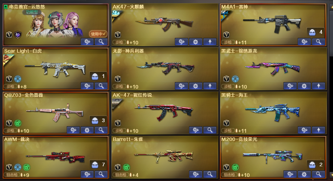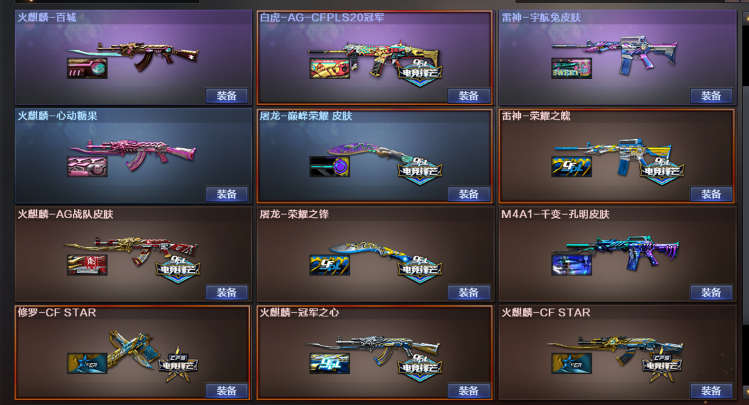 装备描述:云悠悠,M200竞技荣光,火麒麟+冠军之心,雷神+荣耀,白虎+AG冠军,QBZ金色蔷薇,裁决,朱雀大炮,王者之怒,usp雷暴,柯尔特竞技荣光,3修罗,屠龙+荣耀之锋/巅峰荣耀 荣耀之巅178豆,VIP6,爆破全装