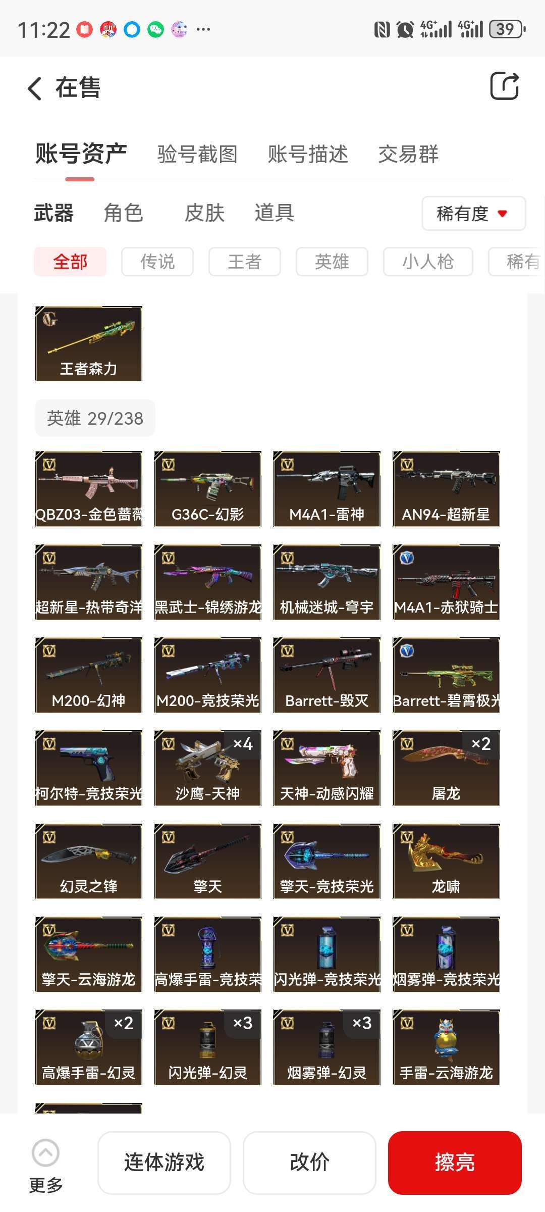装备描述:毁号,涉及毁坏虚拟财产罪及计算机安全罪,请文明游戏素质游戏台 本游戏账号:英雄武器36个 王者武器0个。 装备齐全拥有完美游戏体验。重要的是特殊装备有:AN94-超新星、Barrett-毁灭、M4A1-雷神、QBZ03-金色蔷薇、M200-幻神、M200-竞技荣光、幻灵之锋、擎天-竞技荣光、柯尔特-竞技荣光、烟雾弹-竞技荣光、闪光弹-竞技荣光、高爆手雷-竞技荣光、黑武士-暗月、源·炼狱、源·Barrett-朱雀、源·火麒麟、源·武圣、源-金色蔷薇、灵·QBZ03-金色蔷薇-嘉年华、灵·Barrett-金色蔷薇-甜蜜火力、魂·QBZ03-金色蔷薇-蛇姬、源·武圣glock、关小雨、王者沙漠玫瑰、生化弹匣、Barrett-毁灭音效卡、等,随意畅选。 注意事项: A.游戏过程中请不要恶意挂机或者不文明发言 B.恶意挂机、顶号等行为将被拉黑无法再次下单 C.进入游戏后中途请勿退出登陆,否则无法再次上号 D.部分账号由于异地登录可能会出现密码错误提示,通常再尝试5-6次后可上号 喜欢本账号请点 ☆收藏☆ 方便下次租用,谢谢光临惠顾
