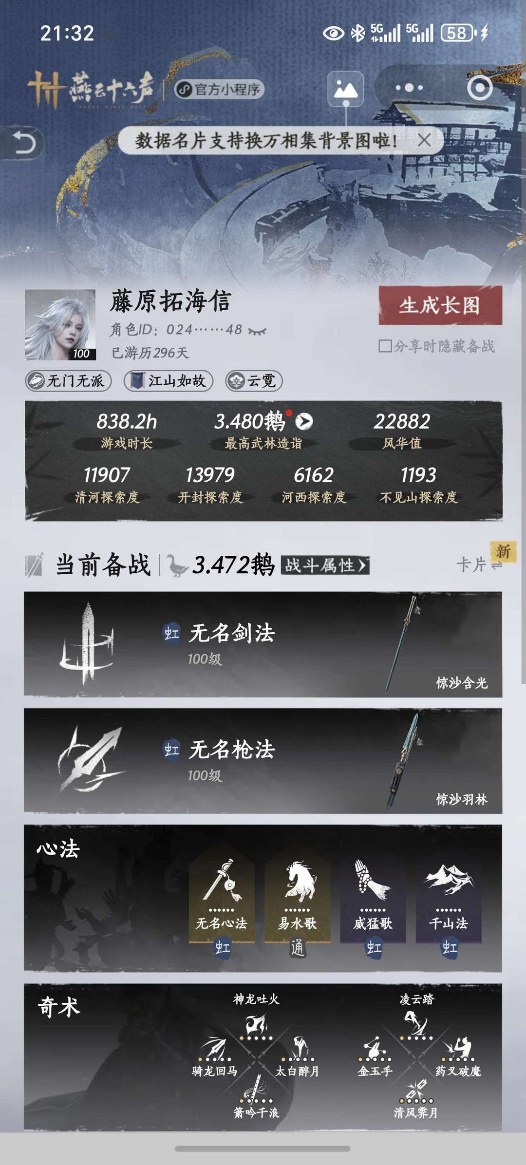 装备描述:燕云十六声成号纯无名带万剑归宗特效毕业心法奇术全六重