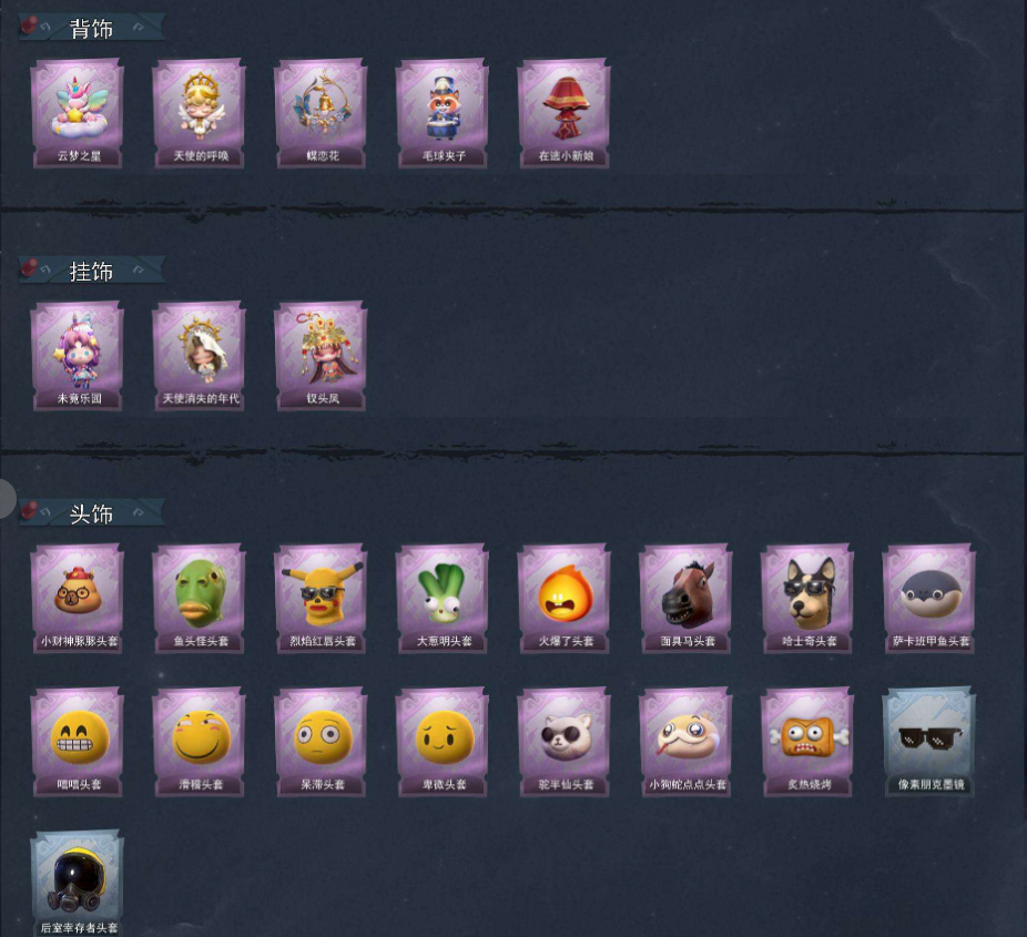 装备描述:一单一结 不顶号 全交给平台改密码别来搞心态!!! 抓住平台拉黑账号段位】超自然传说 【幻梦皮肤数量】1 【金色皮肤数量】2 【紫色皮肤数量】5 【道具皮肤数量】15 【累充】15450 【赛季魔盒】普通魔盒 【员工】小黄、爱丽丝、零、阿念、逍遥、薇薇安、巫铃儿、莉莉、艾伦、爱德华、兰 【幻梦皮肤】巫铃儿-镜生遗梦 【金色皮肤】薇薇安-圣光之谕、巫铃儿-镜花辞 【紫色皮肤】莉莉-除妖小师妹、薇薇安-黑月挽歌、阿念-王子与骑士、爱丽丝-丝缕哀歌、小黄-呱呱雨衣 【道具皮肤】铲子-圣心之泪、音响-happy猫、铲子-龙鳞、传送按钮-昆仑镜、腰包-宝剑八、急救包-蔷薇物语、转轮手枪-新星时代、长鞭-小狗蛇点点鞭、音响-鸣沙鼓、黄牛能量饮料-青玉抱丹、摸金符-祝祷词、夜视仪-金丝眼镜、额外的背包-飞花令、短管猎枪-星光的裁决、桃木剑-永眠曲 【头饰】小财神豚豚头套、鱼头怪头套、烈焰红唇头套、大葱明头套、火爆了头套、面具马头套、哈士奇头套、萨卡班甲鱼头套、嘻嘻头套、滑稽头套、呆滞头套、卑微头套、驼半仙头套、小狗蛇点点头套、炙热烧烤、像素朋克墨镜、后室幸存者头套 【背饰】云梦之星、天使的呼唤、蝶恋