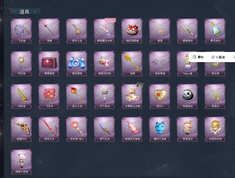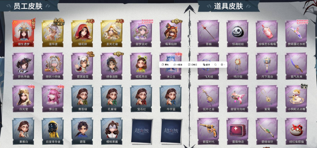 装备描述:【段位】超自然传说 【幻梦皮肤数量】1 【金色皮肤数量】3 【紫色皮肤数量】10 【道具皮肤数量】31 【累充】33960金砖 【赛季魔盒】稀世豪华魔盒 【员工】小黄、爱丽丝、零、阿念、逍遥、薇薇安、巫铃儿、莉莉、艾伦、爱德华、兰 【幻梦皮肤】巫铃儿-镜生遗梦 【金色皮肤】逍遥-莲华渡、薇薇安-圣光之谕、巫铃儿-镜花辞 【紫色皮肤】爱丽丝-甜梦派对、莉莉-莓果陷阱、小黄-异色序曲、莉莉-除妖小师妹、莉莉-情公主、爱丽丝-冰公主、薇薇安-白光莹、小黄-霓裳踏雪、逍遥-绣春逍影、小黄-呱呱雨衣 【道具皮肤】长鞭-飞天绫、长枪-荆棘、除颤仪-弦外之音、短管猎枪-赞萌露比水枪、腰包-绯红柴郡猫、摸金符-紫霄、刺刀-碧络琅环、黄牛能量饮料-青玉抱丹、音响-鸣沙鼓、急救包-蔷薇物语、喷气背包-乘风溯雪、电击枪-甜蜜泡泡枪、铲子-龙鳞、夜视仪-金丝眼镜、音响-happy猫、传送按钮-昆仑镜、葫芦-伏妖塔、额外的背包-飞花令、铲子-圣心之泪、腰包-月下莲台、长鞭-小狗蛇点点鞭、腰包-宝剑八、腰包-惊魂娃娃、摸金符-祝祷词、转轮手枪-新星时代、桃木剑-凤鸣九天、刺刀-紫气东来、黄牛能量饮料-珍珠芭乐莓莓