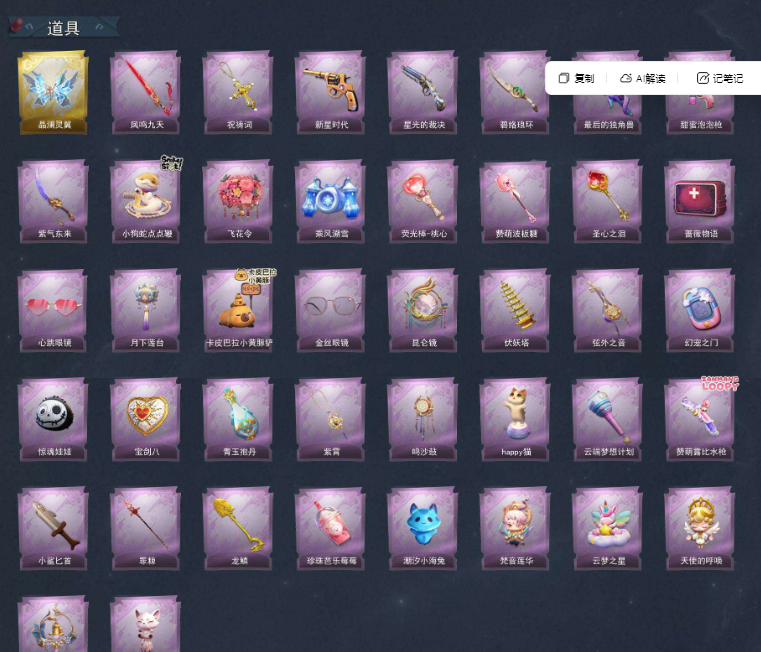 装备描述:【段位】超自然传说 【幻梦皮肤数量】1 【金色皮肤数量】4 【紫色皮肤数量】13 【道具皮肤数量】39 【累充】42380金砖 【赛季魔盒】稀世豪华魔盒 【员工】小黄、爱丽丝、零、阿念、逍遥、薇薇安、巫铃儿、莉莉、艾伦、爱德华、兰 【幻梦皮肤】巫铃儿-镜生遗梦 【金色皮肤】逍遥-莲华渡、薇薇安-圣光之谕、小黄-遗失的童话、巫铃儿-镜花辞 【紫色皮肤】零-搬开山、薇薇安-仙锋小姐、爱丽丝-甜梦派对、艾伦-绒绒对决、莉莉-莓果陷阱、莉莉-除妖小师妹、阿念-王子与骑士、艾伦-水王子、爱丽丝-冰公主、零-青云逸歌、爱丽丝-丝缕哀歌、逍遥-绣春逍影、小黄-呱呱雨衣 【道具皮肤】喷气背包-晶澜灵翼、桃木剑-凤鸣九天、摸金符-祝祷词、转轮手枪-新星时代、短管猎枪-星光的裁决、刺刀-碧络琅环、桃木剑-最后的独角兽、电击枪-甜蜜泡泡枪、刺刀-紫气东来、长鞭-小狗蛇点点鞭、额外的背包-飞花令、喷气背包-乘风溯雪、铲子-赞萌波板糖、铲子-圣心之泪、急救包-蔷薇物语、夜视仪-心跳眼镜、腰包-月下莲台、铲子-卡皮巴拉小黄豚铲、夜视仪-金丝眼镜、传送按钮-昆仑镜、葫芦-伏妖塔、除颤仪-弦外之音、传送按钮-幻宠之门