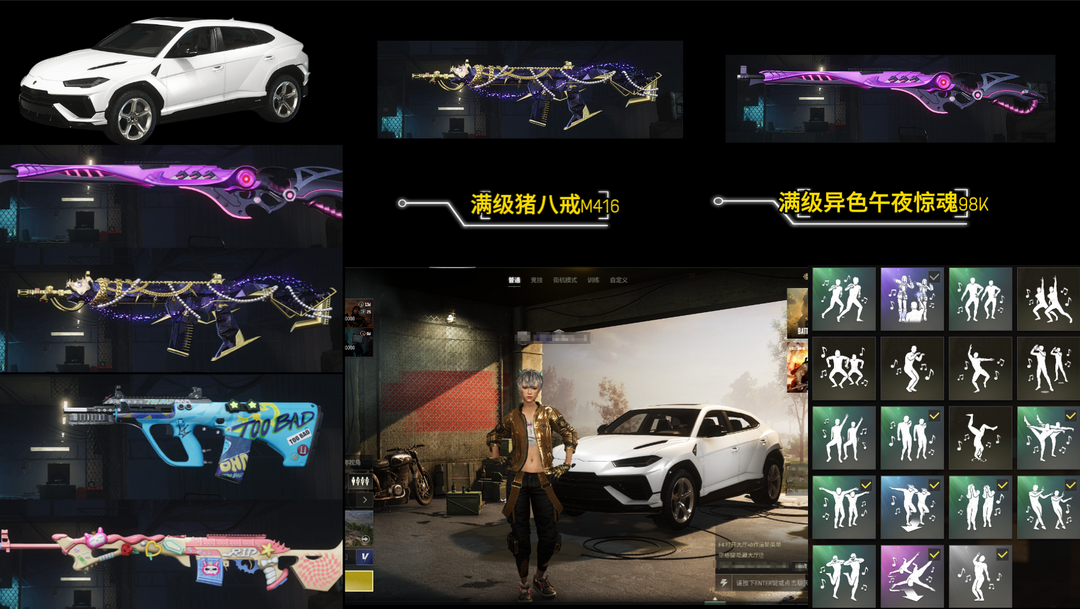 【双满级】兰博基尼✨满级猪八戒M416✨满级异色午夜惊魂98K✨六级粉梦德拉贡✨权志龙AUG✨彩色烟