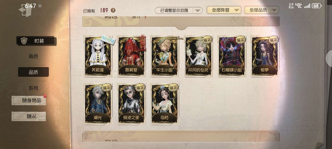 装备描述:金皮全标~回声联动皮多~采风的仙灵~华生小姐~石榴碟小姐~恒梦~溯光~倒逆之汞~芙莉莲