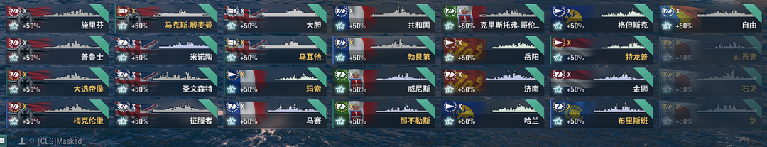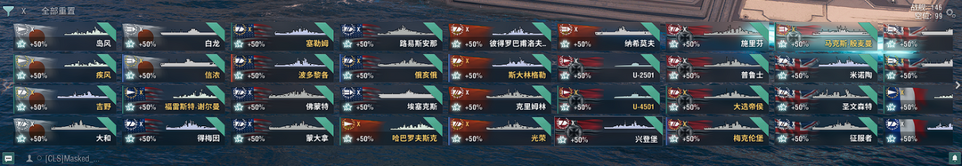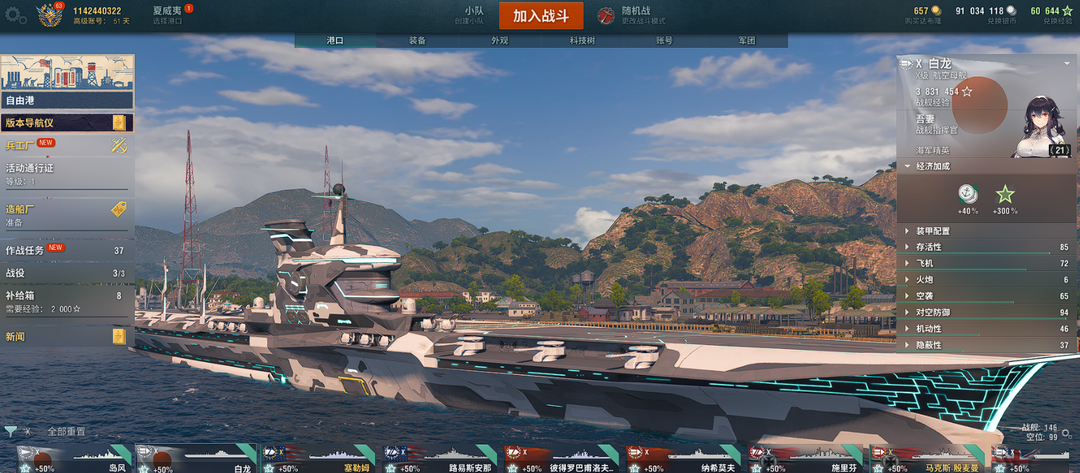 9艘超战49艘X级,低级船若干,全系特殊舰长除泛美系,白龙岛风大和共和国蒙大拿兴登堡有特殊皮肤